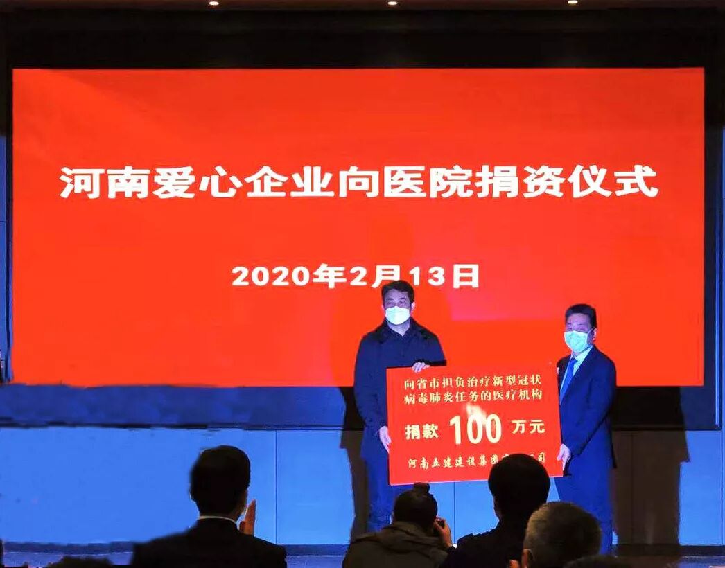 2月13日上午11时,河南省“爱心企业向医院捐资仪式”在郑州市华原酒店举行,河南五建集团等九家企业分别向郑大一附院、河南省人民医院等六家省市担负治疗新型冠状病毒肺炎任务的医疗机构进行了捐资。郑州市委副书记、纪委书记、监委主任周富强、市政协副主席王万鹏、郑州市城乡建设局党组书记杨虎臣等领导出席了捐资仪式。