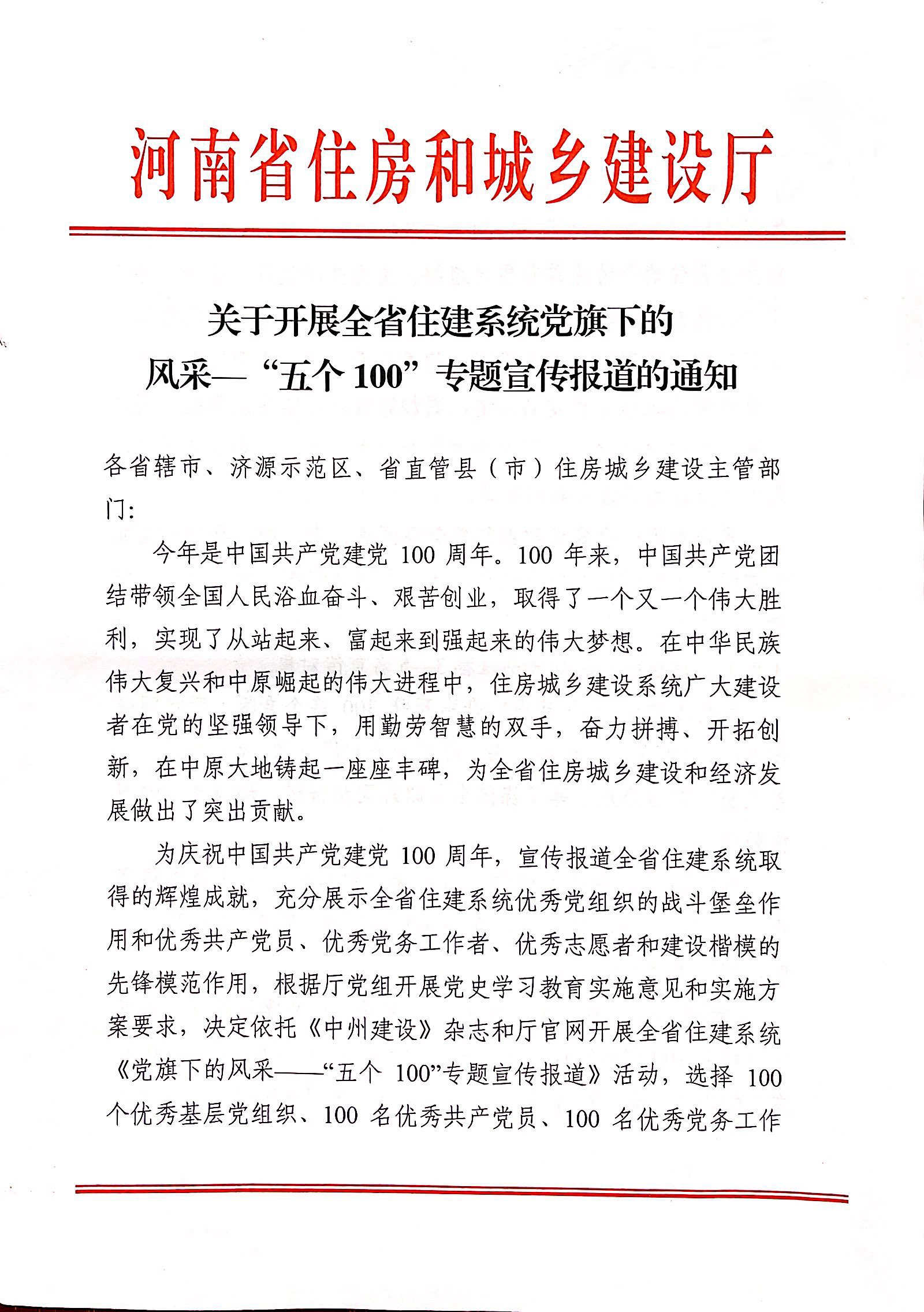 关于转发河南省住房和城乡建设厅《关于开展全省住建系统党旗下的风采——“五个100”专题宣传报道的通知》的函