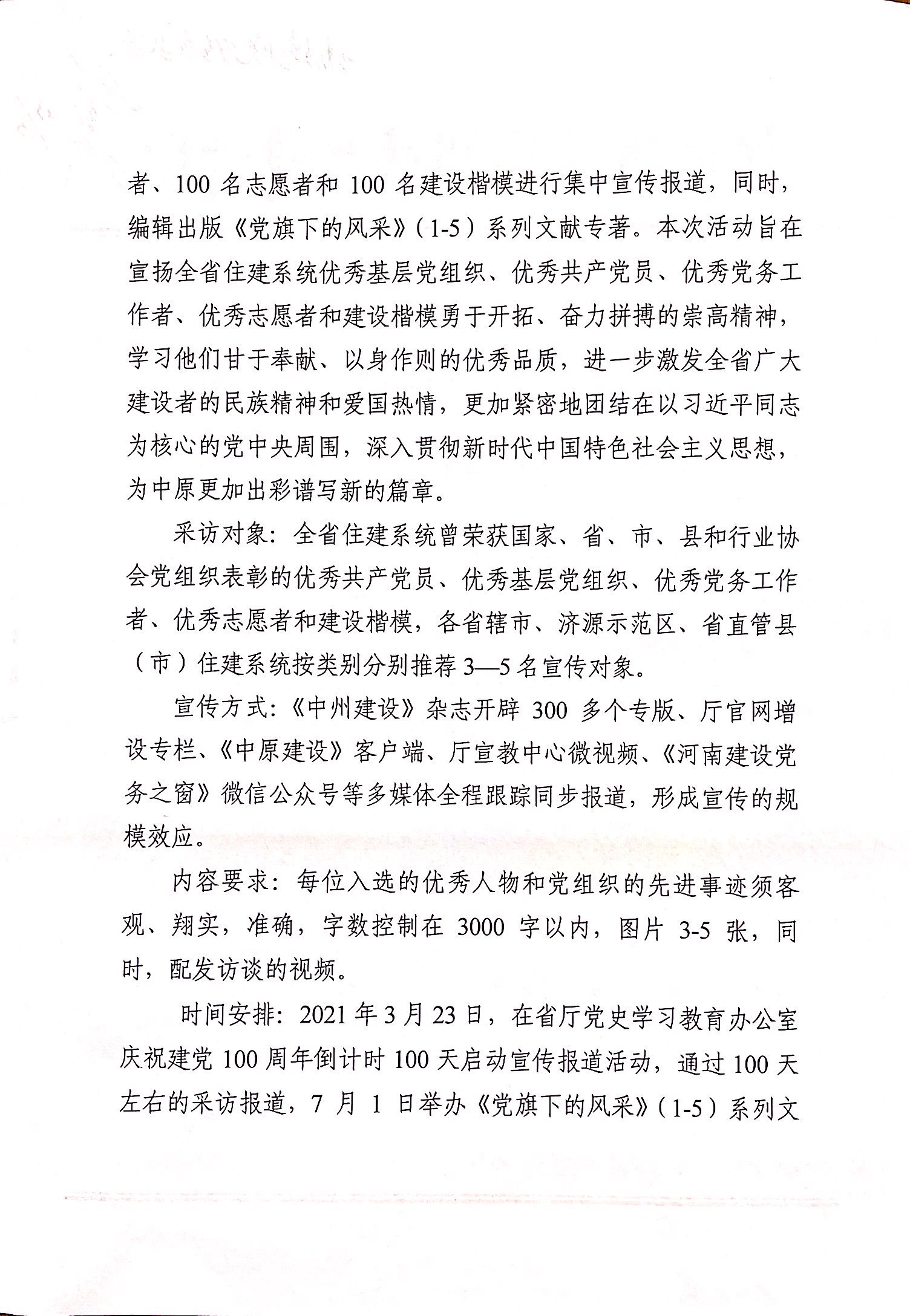 为庆祝中国共产党建党100周年,宣传报道全省住建系统取得的辉煌成就,充分展示全省住建系统优秀党组织的战斗堡垒作用和优秀共产党员、优秀党务工作者、优秀志愿者和建设楷模的先锋模范作用,河南省住建厅决定依托《中州建设》杂志和厅官网开展全省住建系统《党旗下的风采——“五个100”专题宣传报道》活动,请大家根据文件通知积极报送先进事迹材料。